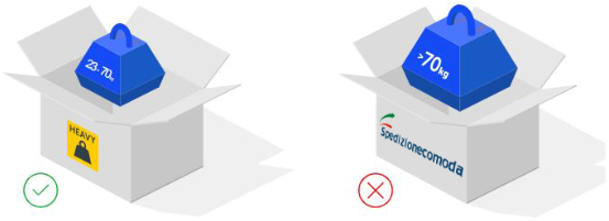 Accettiamo colli fino a 70 kg anche senza pallet; tuttavia, per pesi superiori a 30 kg possono essere applicati supplementi. Per motivi di sicurezza, applica un’etichetta “HEAVY” su tutti i colli che superano 23 kg.