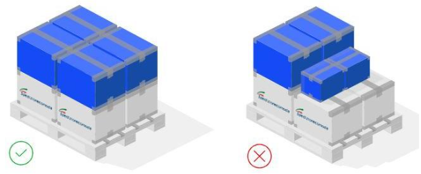 La parte superiore del pallet deve essere piatta, rigida e impilabile. Pallet non impilabili (con profili irregolari o “a punta”) comportano supplementi e aumentano il rischio di danni perché non possono essere stoccati in colonna in sicurezza.