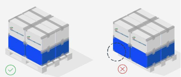 I colli devono rientrare perfettamente nel perimetro del pallet: pallet con sporgenze non sono accettati. Le sporgenze si danneggiano facilmente durante la movimentazione e impediscono una corretta sovrapposizione in magazzino e in transito.