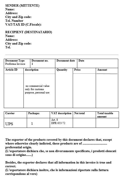 La fattura proforma, o proforma invoice in inglese, è un documento necessario per spedire in Italia fuori dall’Unione Europea a fini non commerciali. Infatti, questo documento fornisce alle autorità doganali informazioni importanti sulla spedizione e fa sì che il vostro pacco arrivi a destinazione senza problemi.