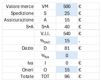 Valore merce: €500| Spedizione+assicurazione: € 40 | Dazio (20%): € 81 | VAT UK (20%): € 108 | Oneri: € 15 | Totale oneri all’import: € 231